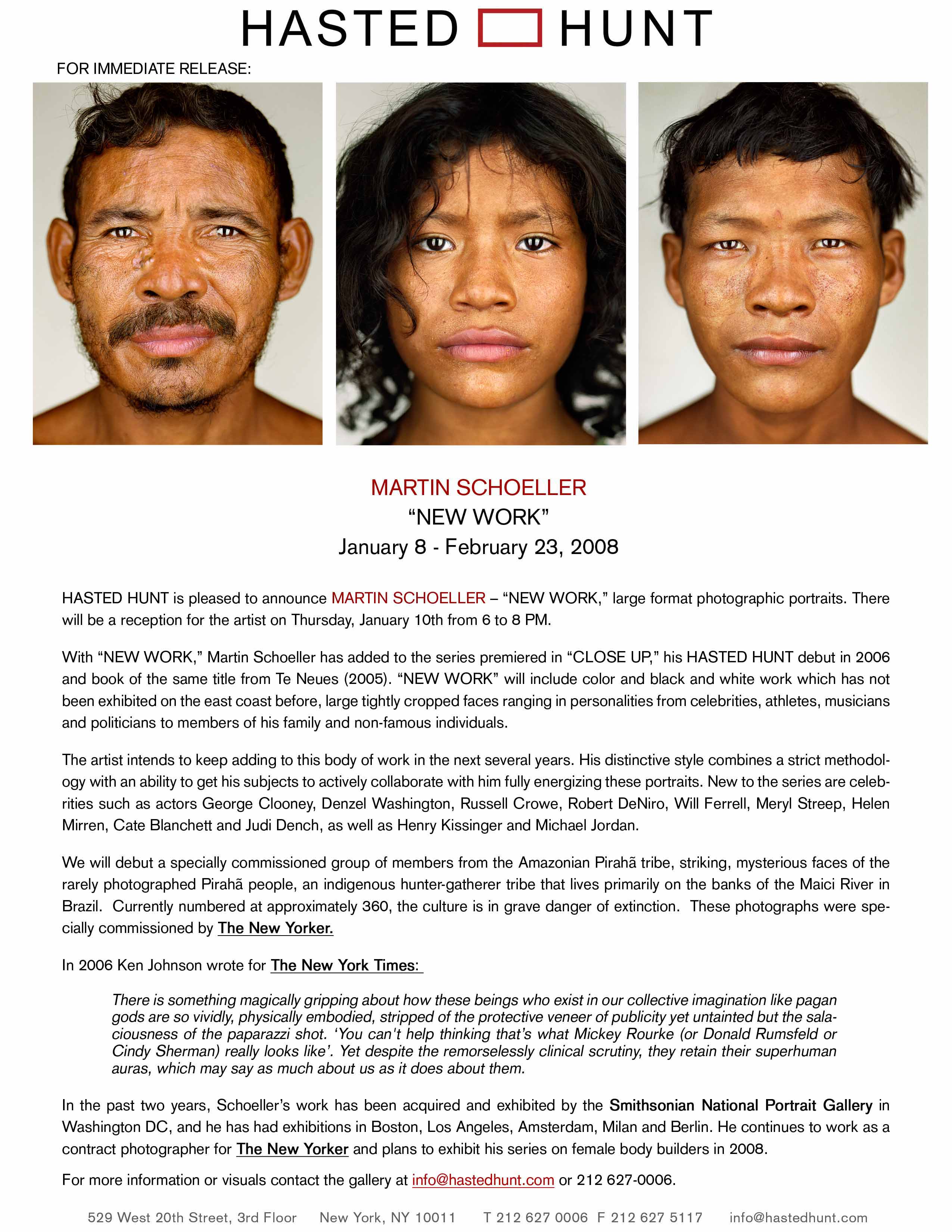 Hasted Hunt is pleased to announce Martin Schoeller – “New Work,” large format photographic portraits. There will be a reception for Martin Schoeller on Thursday, January 10th from 6 to 8 PM.